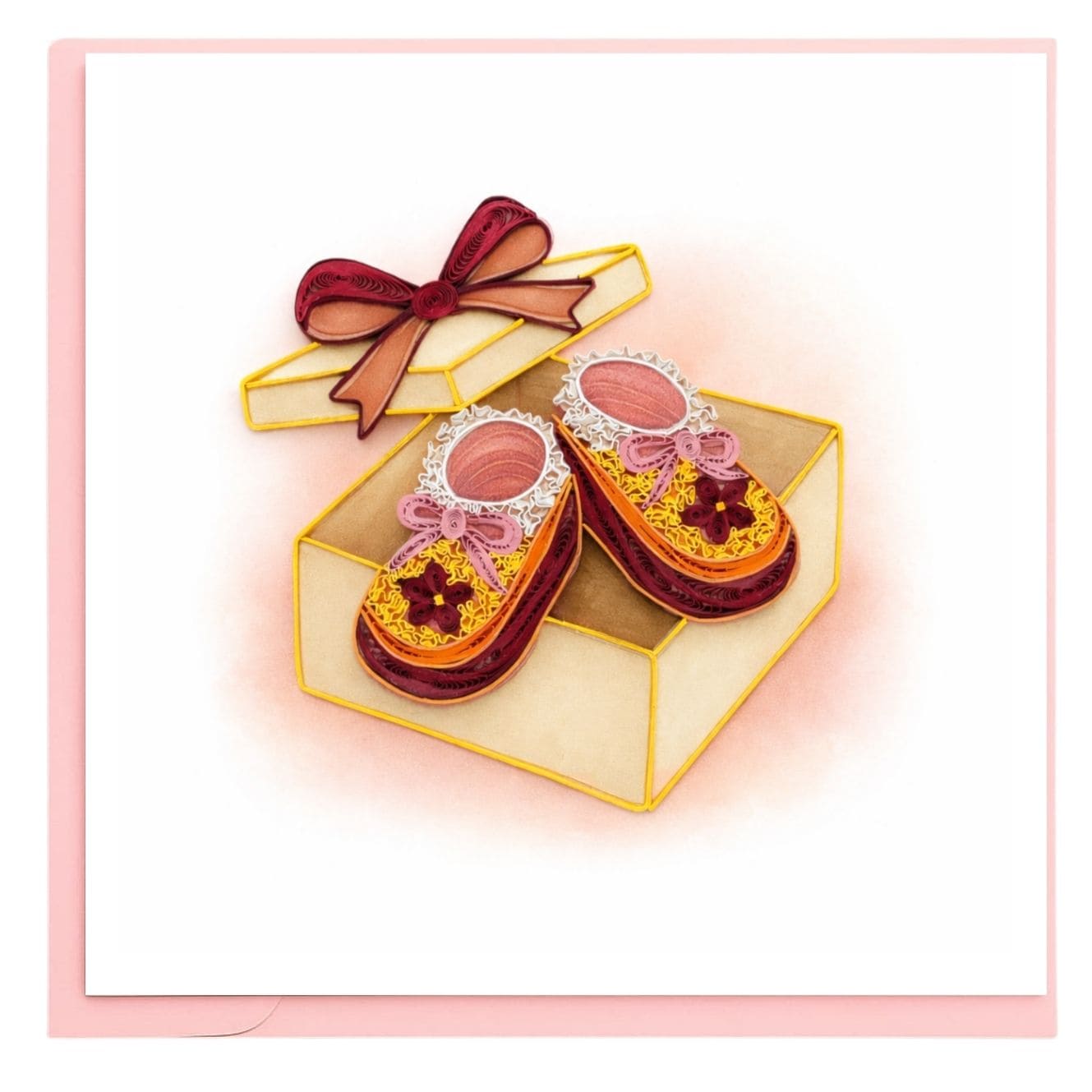 A sweet handmade quilling card featuring a pair of baby shoes nestled inside a gift box with a ribboned lid. Soft colors and delicate paper details create a warm, heartfelt design, perfect for baby showers, newborn celebrations, baby announcements, or welcoming a new little one into the world.
