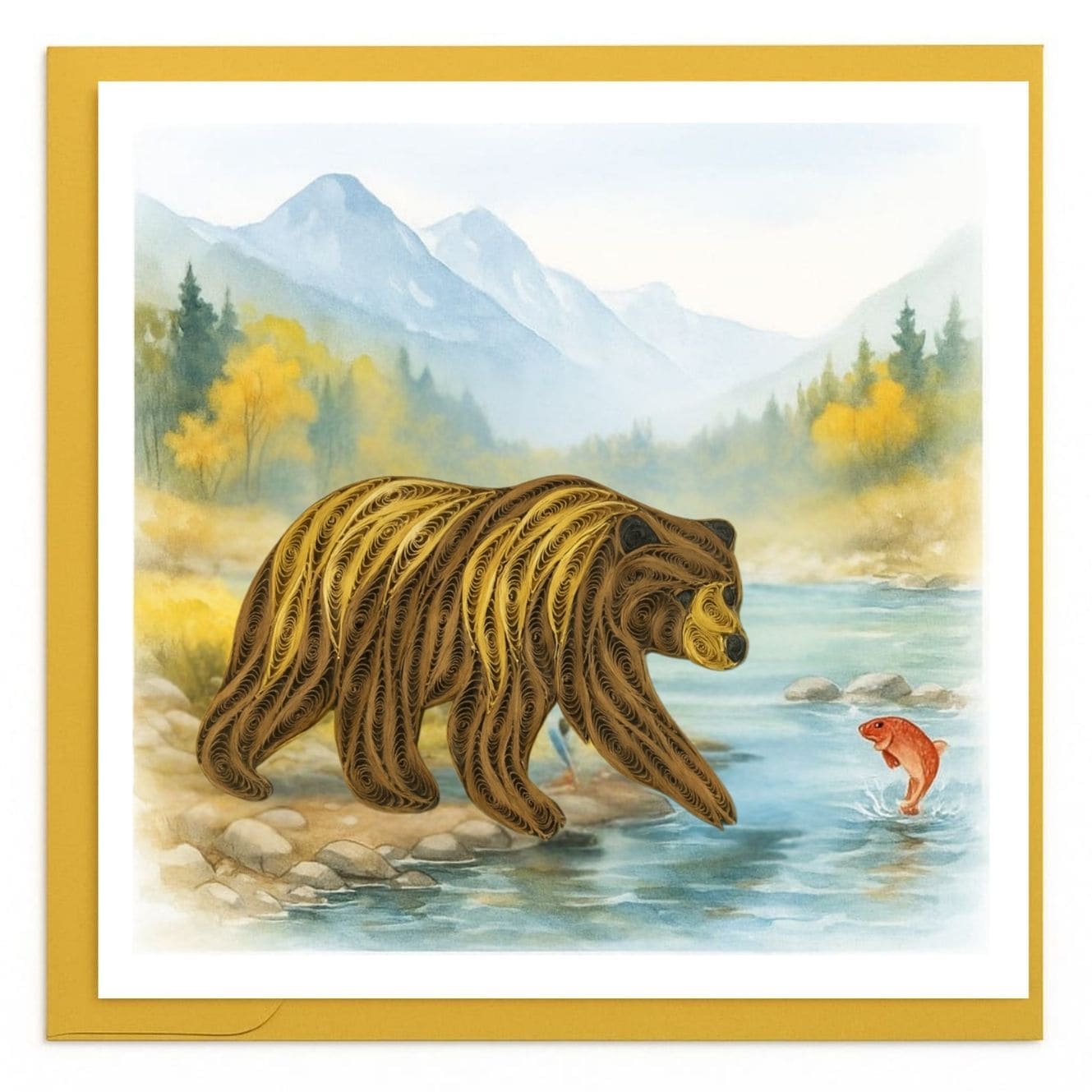 This quilling card portrays a powerful brown bear reaching into a flowing river as a salmon leaps from the water. Intricately layered paper coils create rich texture throughout the bear’s thick fur, giving the animal weight and realism. The surrounding mountain landscape and soft autumn tones enhance the natural wilderness atmosphere, making this design perfect for wildlife lovers, rustic themes, and nature-inspired occasions.