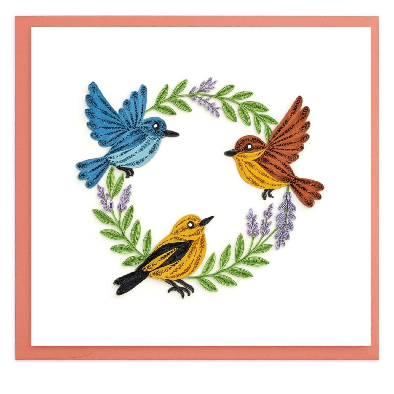 A circular quilling composition with three songbirds crafted from layered paper coils. Curved strips define feathers, leaves, and branches, creating balance and depth within the design.