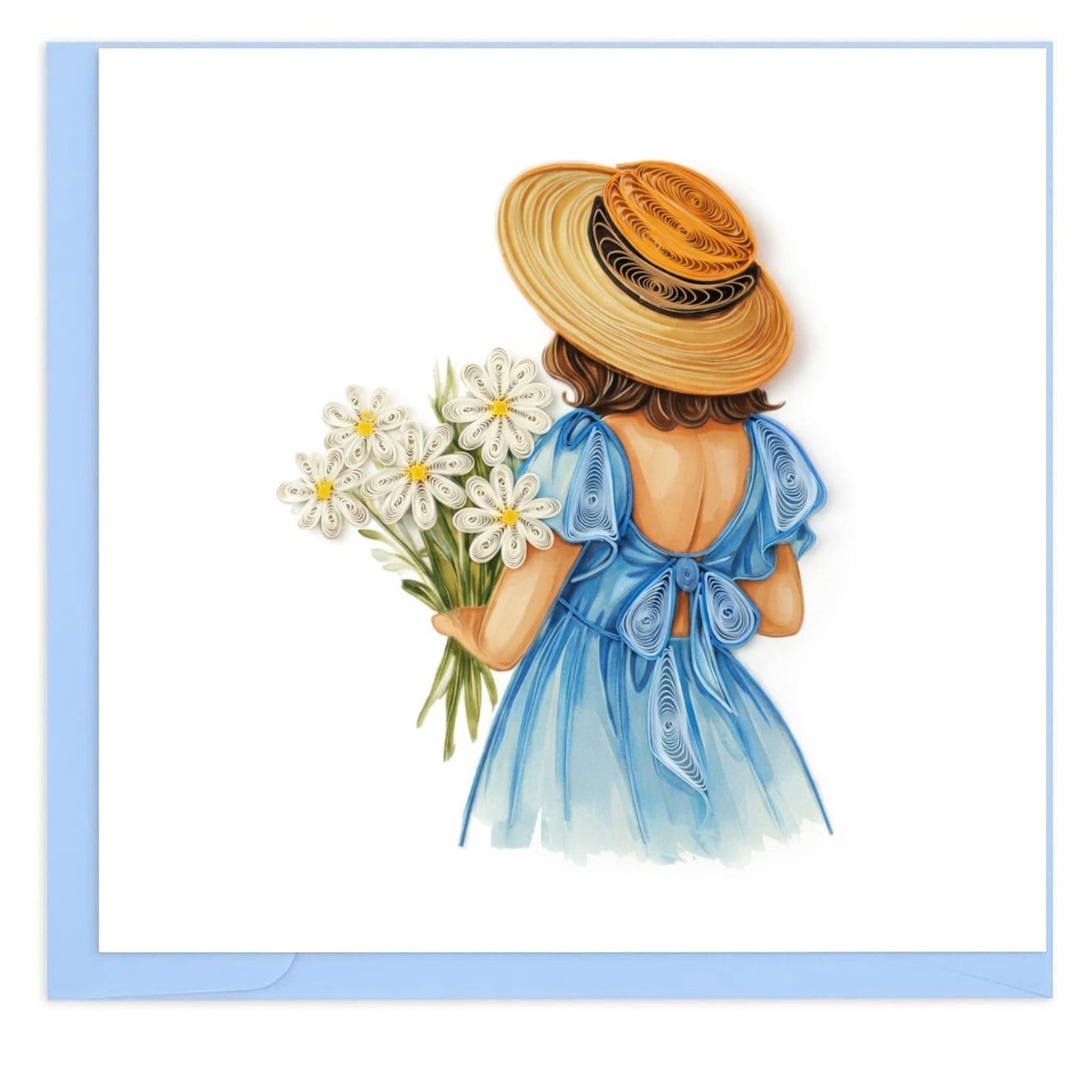 A graceful quilling card featuring a young girl in a flowing blue dress, wearing a straw hat and holding a bouquet of delicate white flowers. Soft colors and handcrafted paper details create a gentle, romantic design, perfect for birthdays, thank you notes, Mother’s Day, or thoughtful everyday gifting.