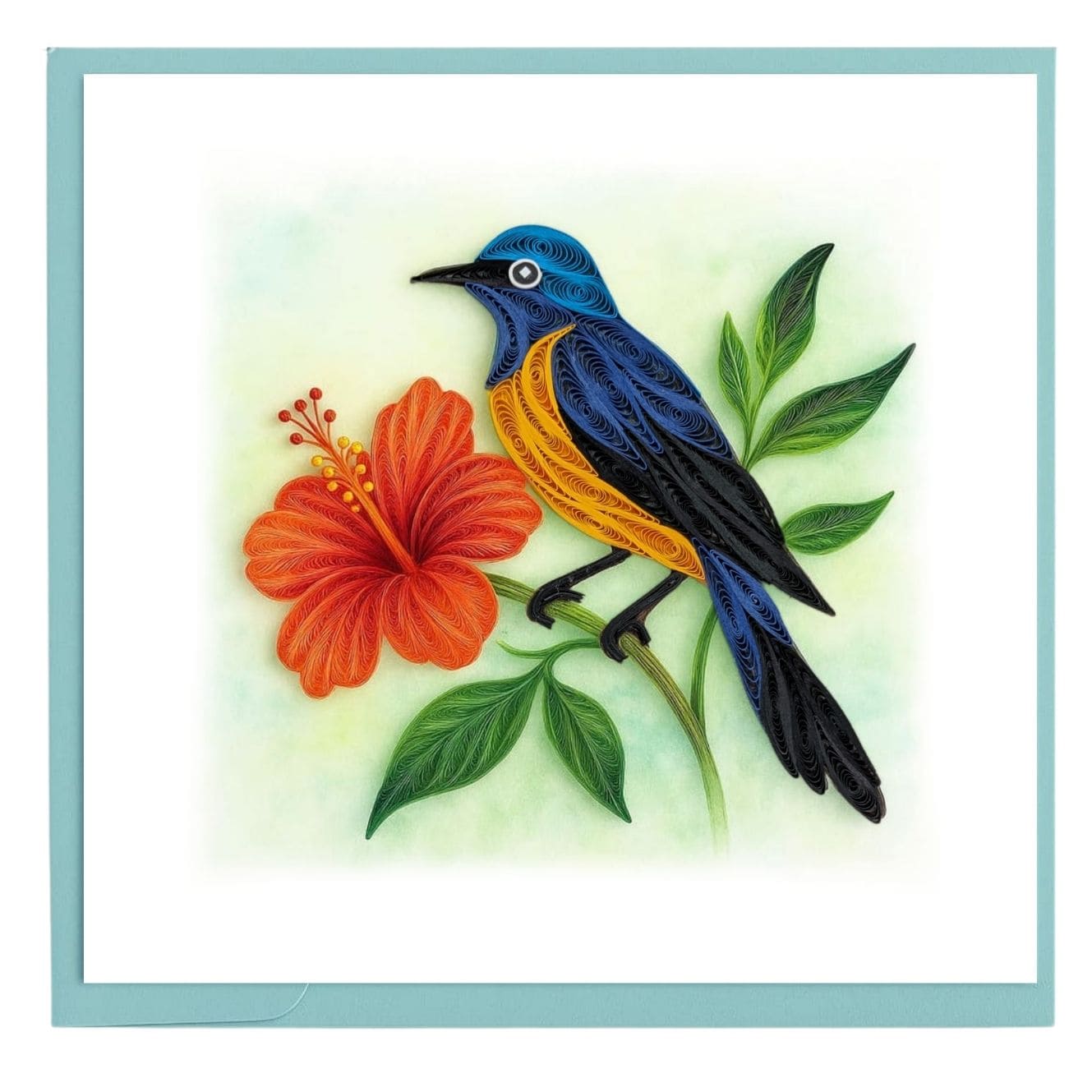Quilling illustration of a blue songbird perched beside a hibiscus flower, using curved paper strips to create depth and flowing feather details.