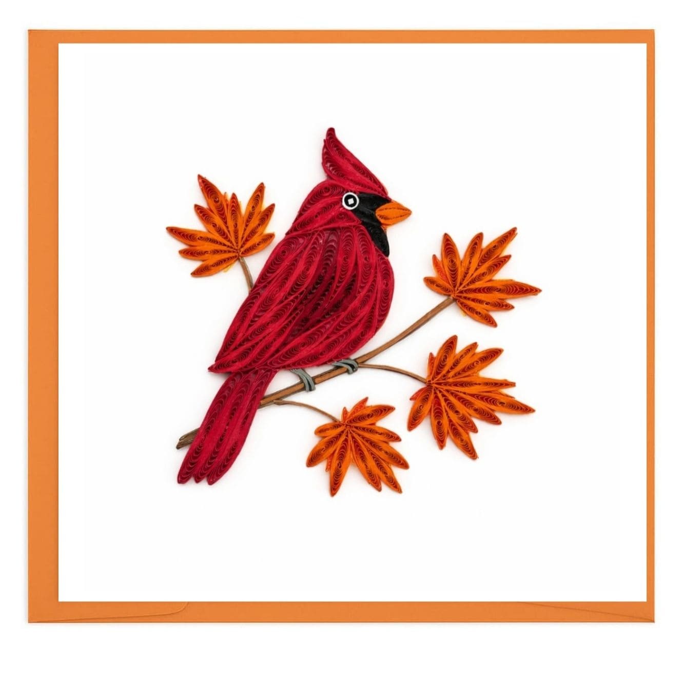 This quilled cardinal is surrounded by warm autumn leaves, combining rich red and orange tones in a bold seasonal composition. The carefully rolled paper strips create feathered texture and give the design depth and movement. Handmade one piece at a time, it brings together the beauty of wildlife and fall color in a striking work of quilling art.