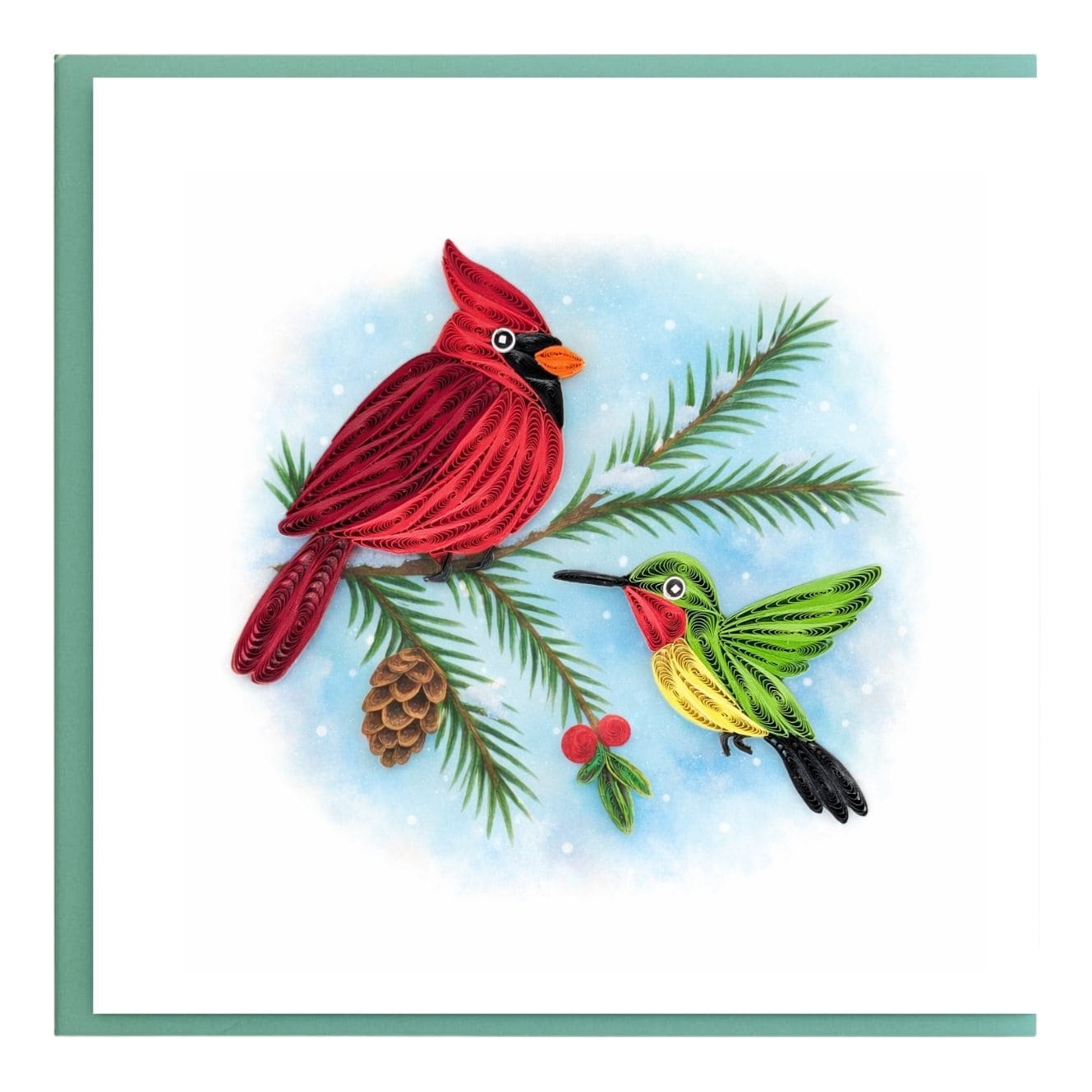 This quilling card features a red cardinal and a small green songbird resting on a snowy evergreen branch. Pine needles, berries, and a pinecone add seasonal charm while the textured paper coils bring the birds to life. The cool winter backdrop makes this design perfect for holiday cards, winter wishes, or festive greetings.