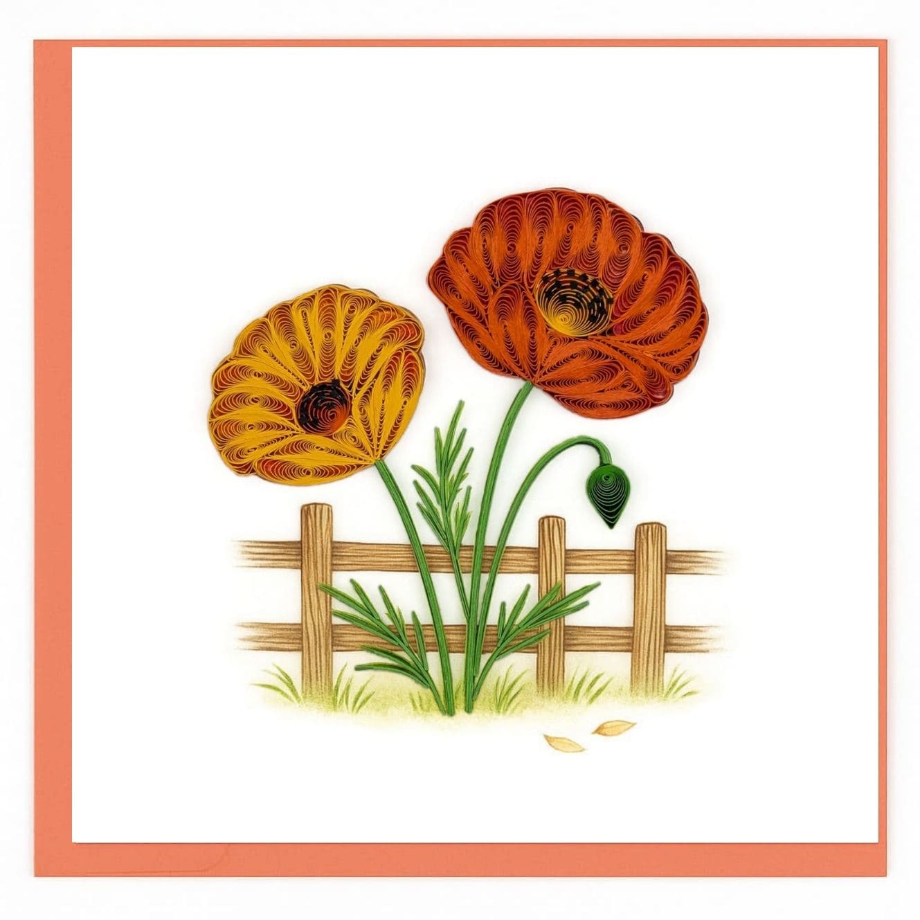 Paper quilling scene showing two cardinals perched on a pine branch, combining bold color coils with winter-themed details.