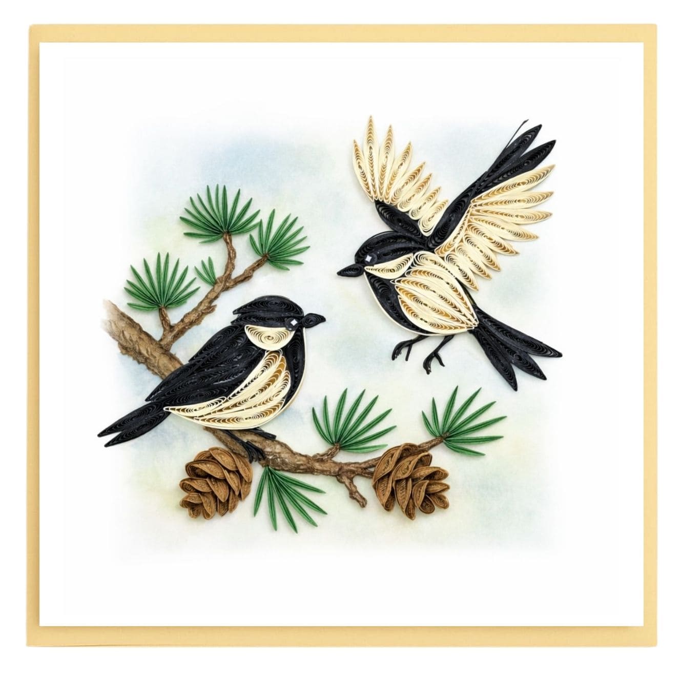 A pair of quilled chickadees rests on a pine branch with pinecones, rendered in delicate coils that create soft texture and natural detail. The black, cream, and earthy tones give the piece a calm woodland feel. Handcrafted with precision, this design captures a peaceful moment in nature through elegant paper artistry.