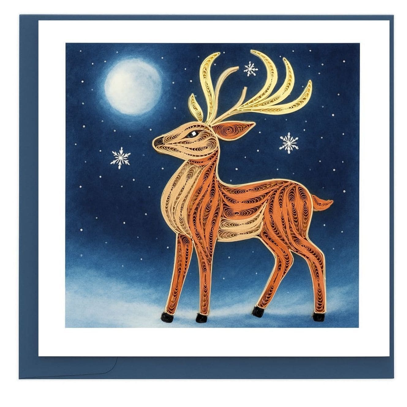 Calm strength is shaped through flowing quilling lines. This serene card features a reindeer standing beneath a winter moon, rendered in layered paper coils that create depth, stillness, and a quiet nocturnal mood. A refined piece inspired by nature, silence, and handcrafted detail.