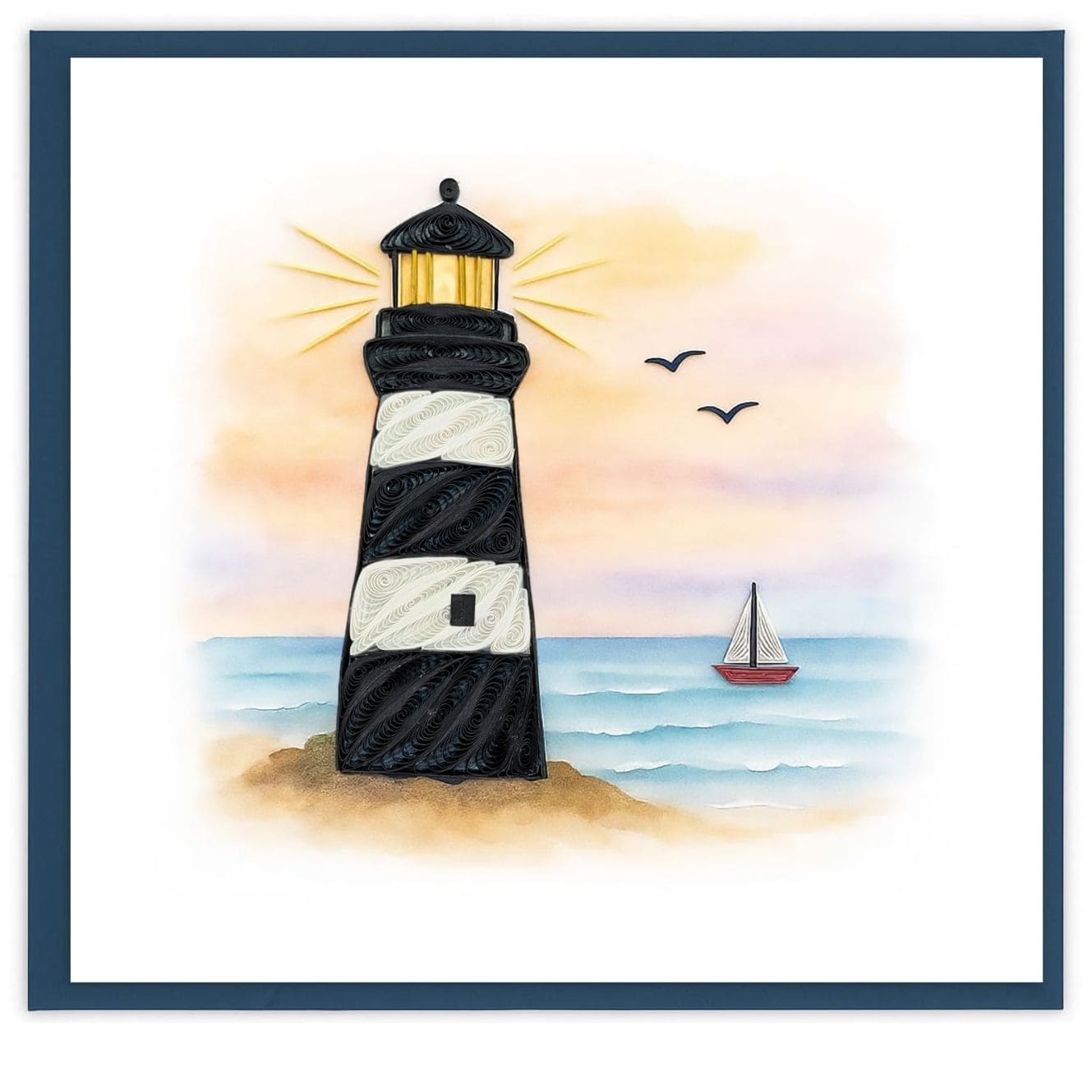 Hand-assembled paper quilling scene of a lighthouse by the sea, with layered coils forming waves, sky, and architectural textures.