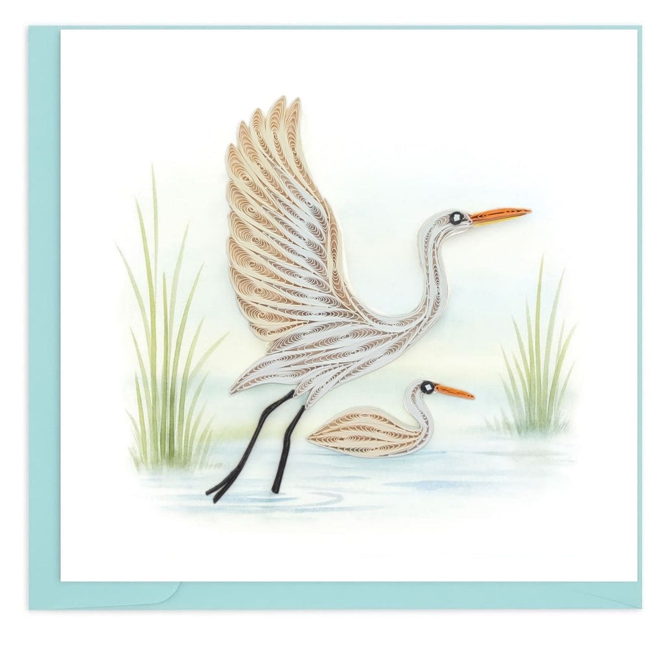 A calm nature-inspired quilling card featuring an elegant heron with its young in a peaceful wetland scene. Soft colors and flowing paper details create a gentle, timeless design, suitable for many occasions such as birthdays, thank you notes, or nature lovers’ gifts.
