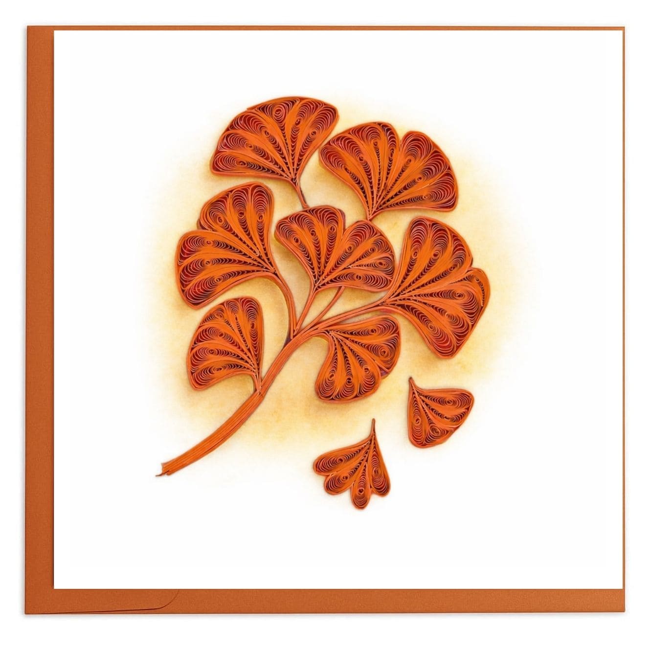 An elegant ginkgo leaf rendered in rich orange tones, shaped with flowing quilled lines that create natural movement and depth. The fan-shaped leaves symbolize longevity, resilience, and quiet beauty, making this card a refined choice for meaningful notes, nature lovers, or timeless gifting.