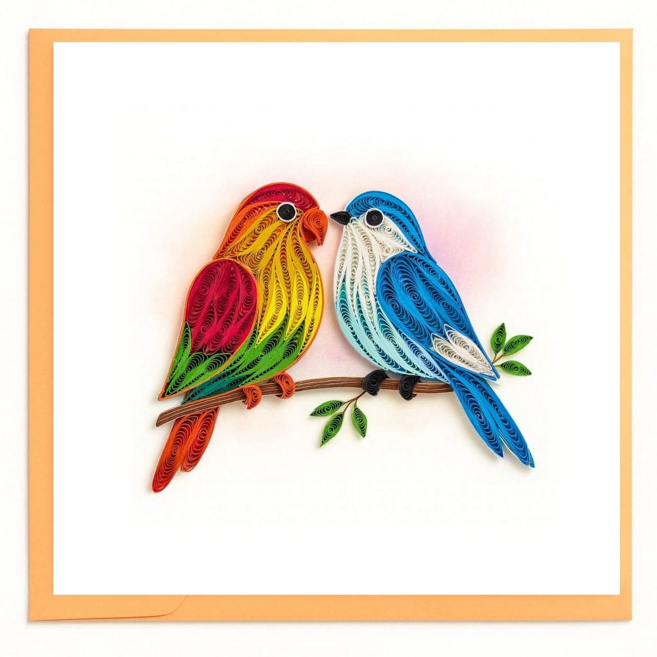 Handcrafted paper quilling card featuring two vibrant love birds perched closely on a branch, symbolizing affection, harmony, and togetherness—perfect for anniversaries, weddings, or heartfelt everyday moments.