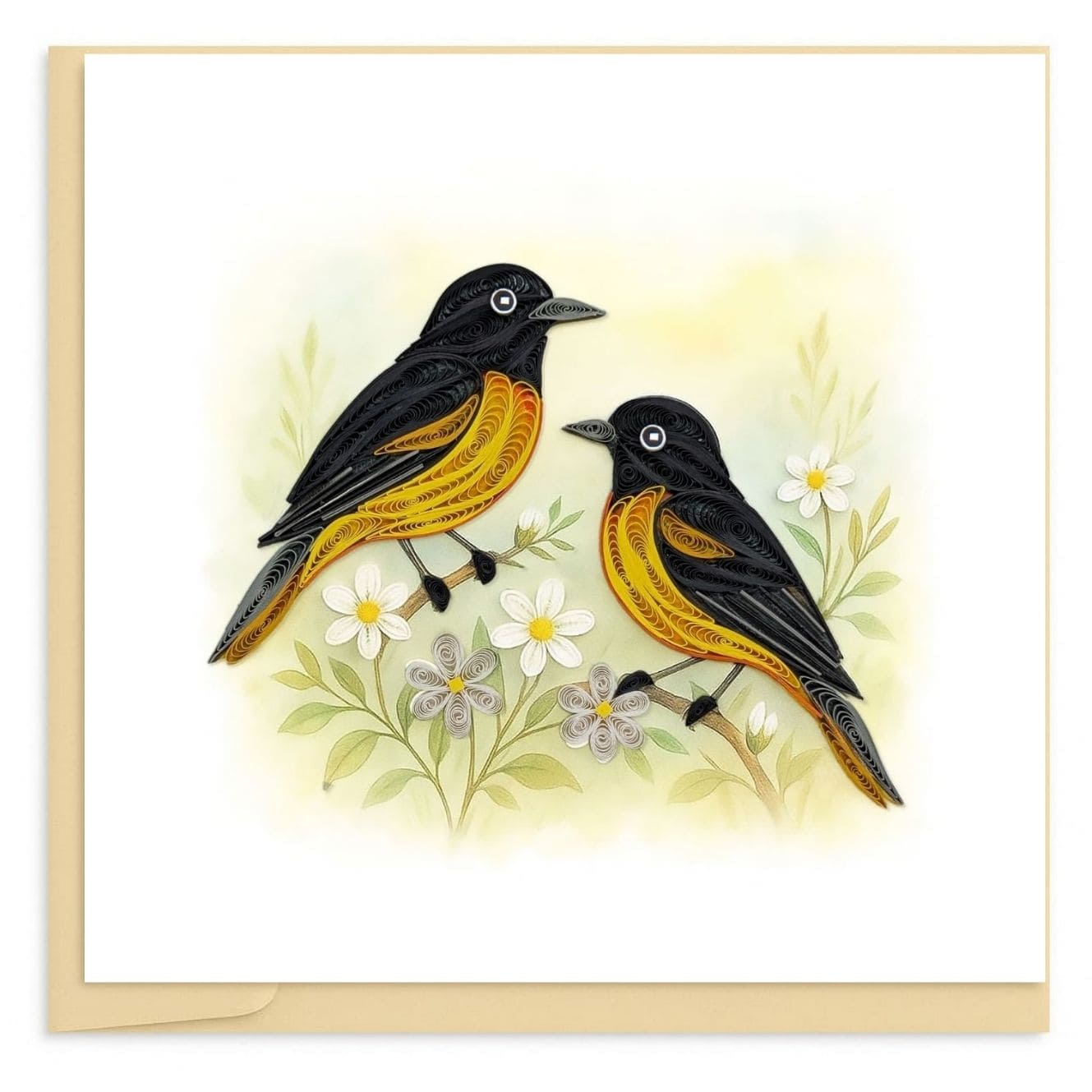 Two orioles resting among soft florals, crafted in layered paper quilling with warm yellow tones and gentle botanical details.