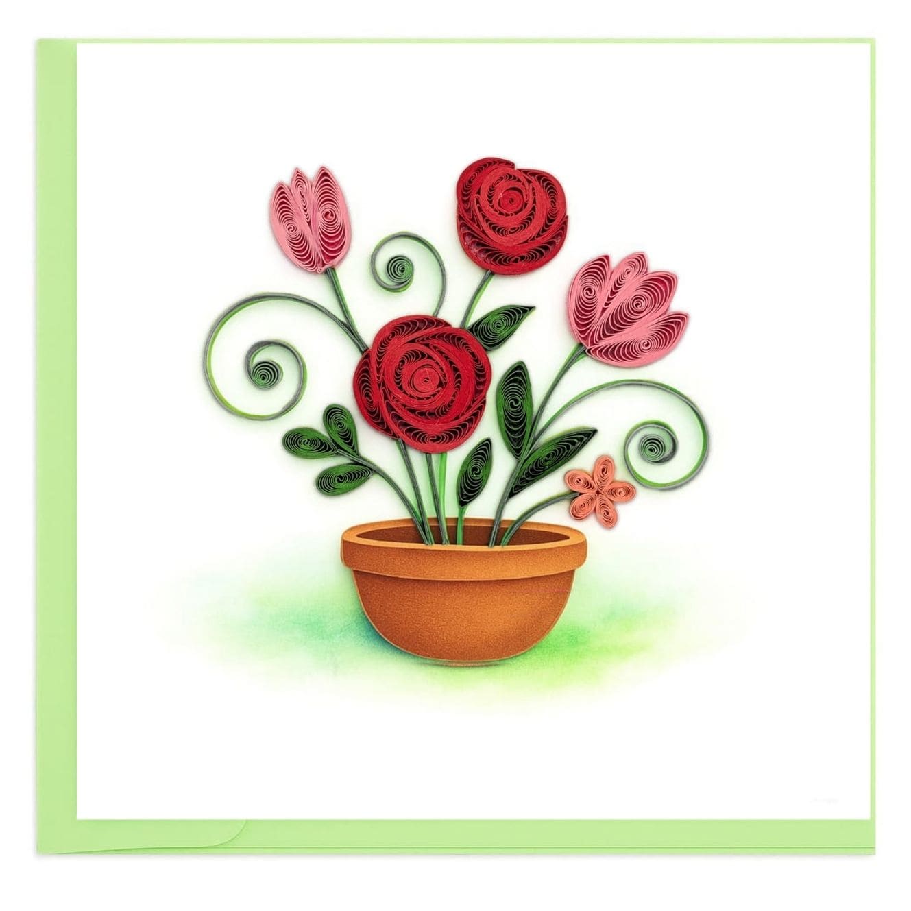 Curving stems and blooming flowers rise gracefully from a simple garden pot, shaped with flowing quilling lines for a playful yet elegant feel. The soft movement and balanced composition bring warmth, charm, and a sense of joyful growth to this timeless floral design.