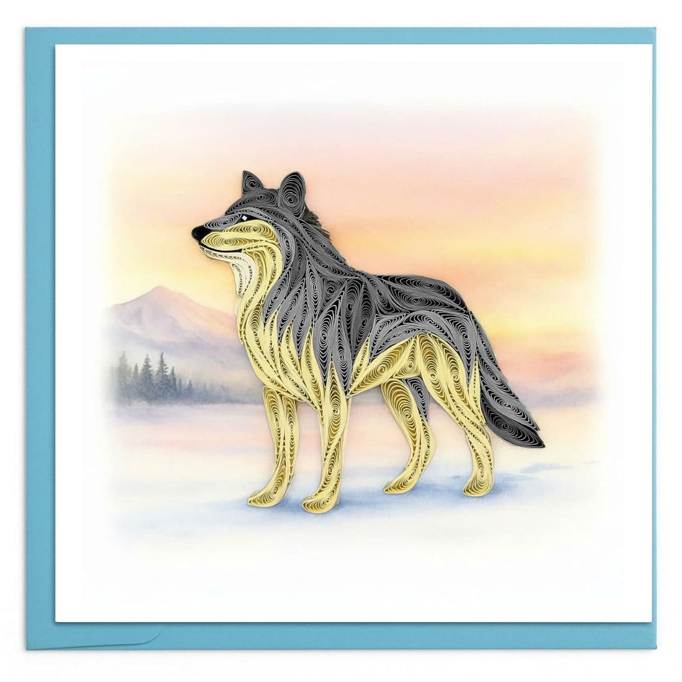 This design features a lone wolf standing against a soft sunset sky with distant mountains in the background. Layered paper quilling shapes define the wolf’s strong silhouette and flowing fur, giving the artwork depth and refinement. The warm glow of the horizon enhances the quiet, watchful mood, making this card suitable for encouragement, reflection, or appreciation of untamed landscapes.
