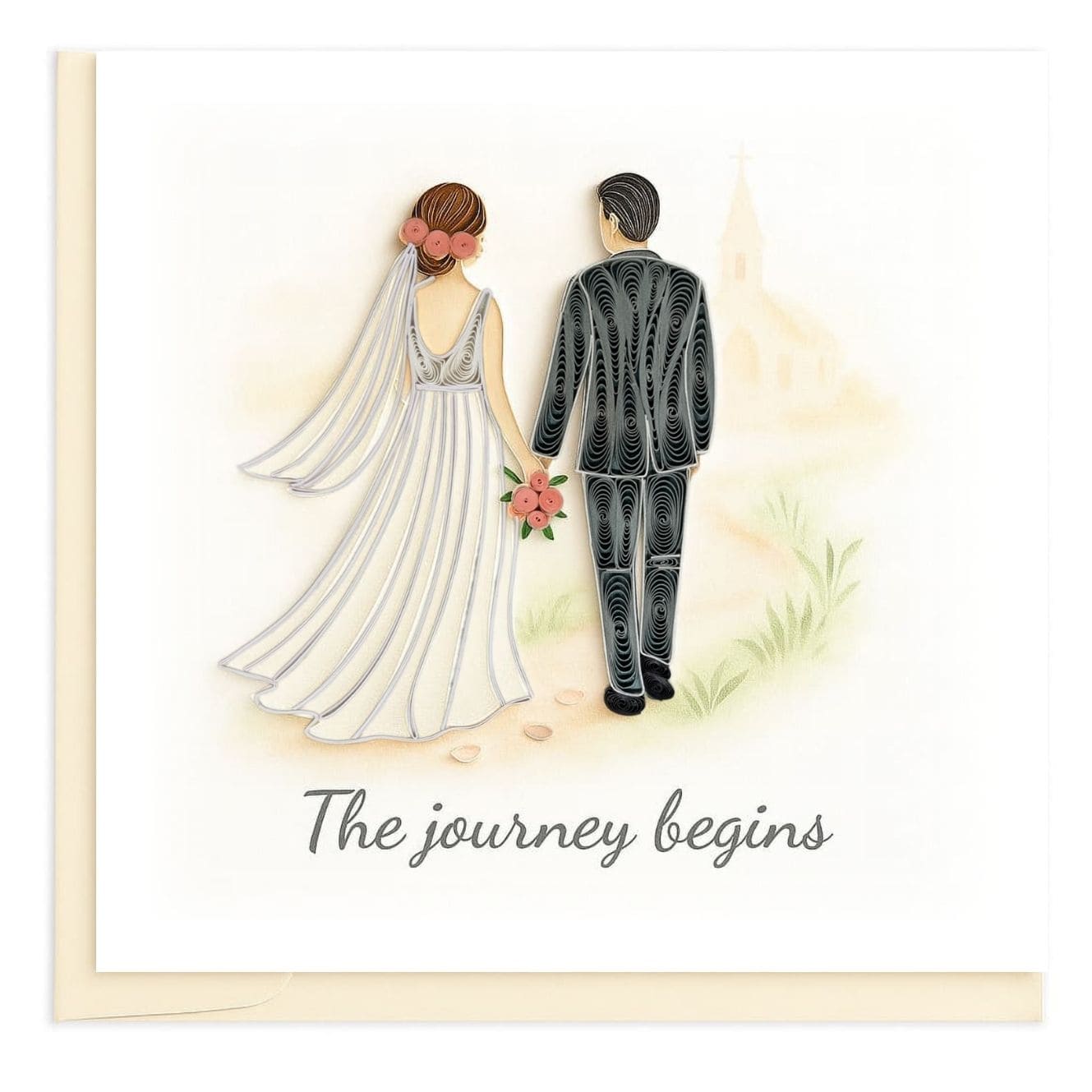 This romantic quilling card portrays a bride and groom walking forward together beneath the words “The journey begins.” Flowing paper coils shape the bride’s gown and the groom’s suit, adding elegant dimension and movement. The soft, dreamy background enhances the emotional tone, making this design perfect for weddings, engagements, or congratulatory messages.