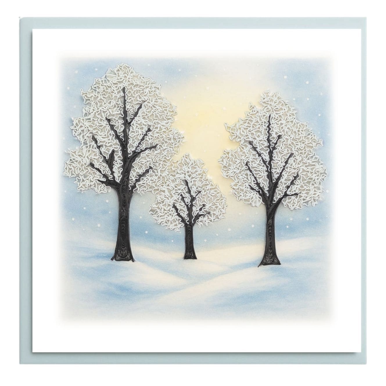 Quiet stillness is shaped through delicate quilling lines. This serene card features snow-covered trees standing beneath a pale winter sky, with layered paper coils creating depth, softness, and a calm seasonal atmosphere. A refined piece inspired by silence, balance, and handcrafted detail.